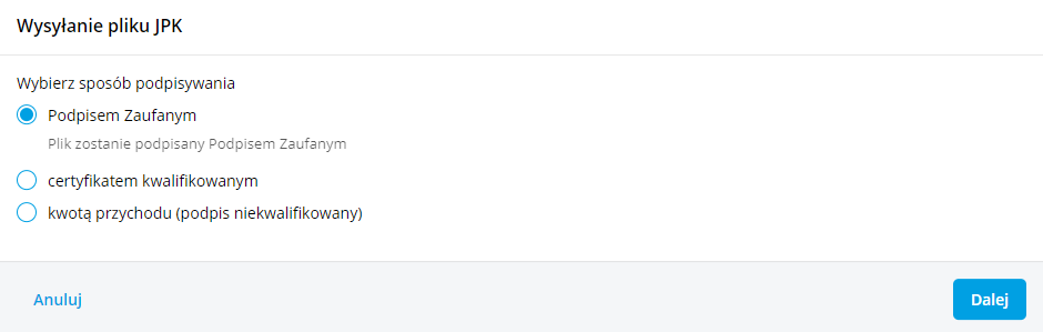 Jeżeli plik jest już podpisany Podpisem Zaufanym wysyłka nastąpi od razu po kliknięciu w przycisk. W przeciwnym wypadku pojawi się okno z wyborem sposobu podpisania pliku.
