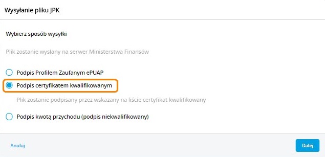 W tym artykule opisaliśmy, jak można wysłać JPK podpisem kwalifikowanym. Jeżeli podatnik nie jest osobą fizyczną to podczas wysyłki zostanie poproszony o wskazanie lokalnego podpisu kwalifikowanego i podpisanie nim pliku.