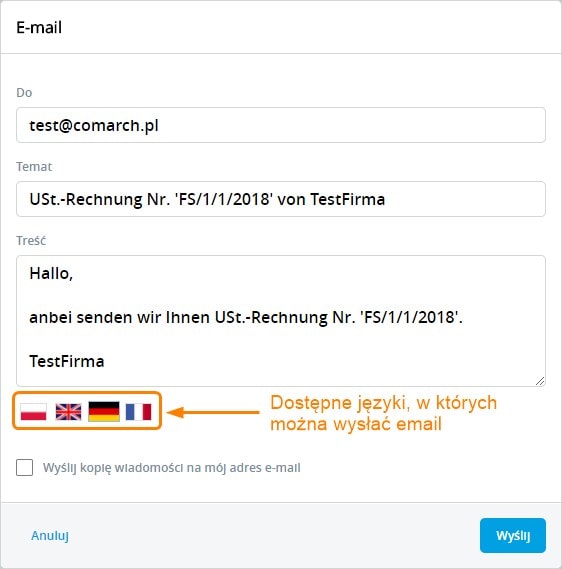 Krok trzeci – jeśli uzupełniliśmy na karcie kontrahenta, który jest wpisany na dokumencie, adres e-mail, to na okienku, które się wyświetli zostanie on automatycznie wczytany. Jeśli nie, będziemy musieli wpisać adres ręcznie. Następnie wybieramy język, w którym ma zostać wysłany mail. Podpowie się treść maila, którą mamy zdefiniowaną w „Edytorze maili” – jest ona dostępna do edycji przez użytkownika. Możemy również zaznaczyć parametr „Wyślij kopię…”, jeśli chcemy również otrzymać tę wiadomość na swoją skrzynkę pocztową. Po zakończeniu edycji, klikamy „Wyślij”.