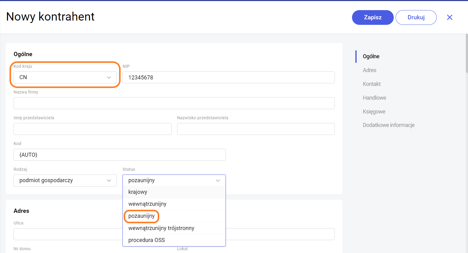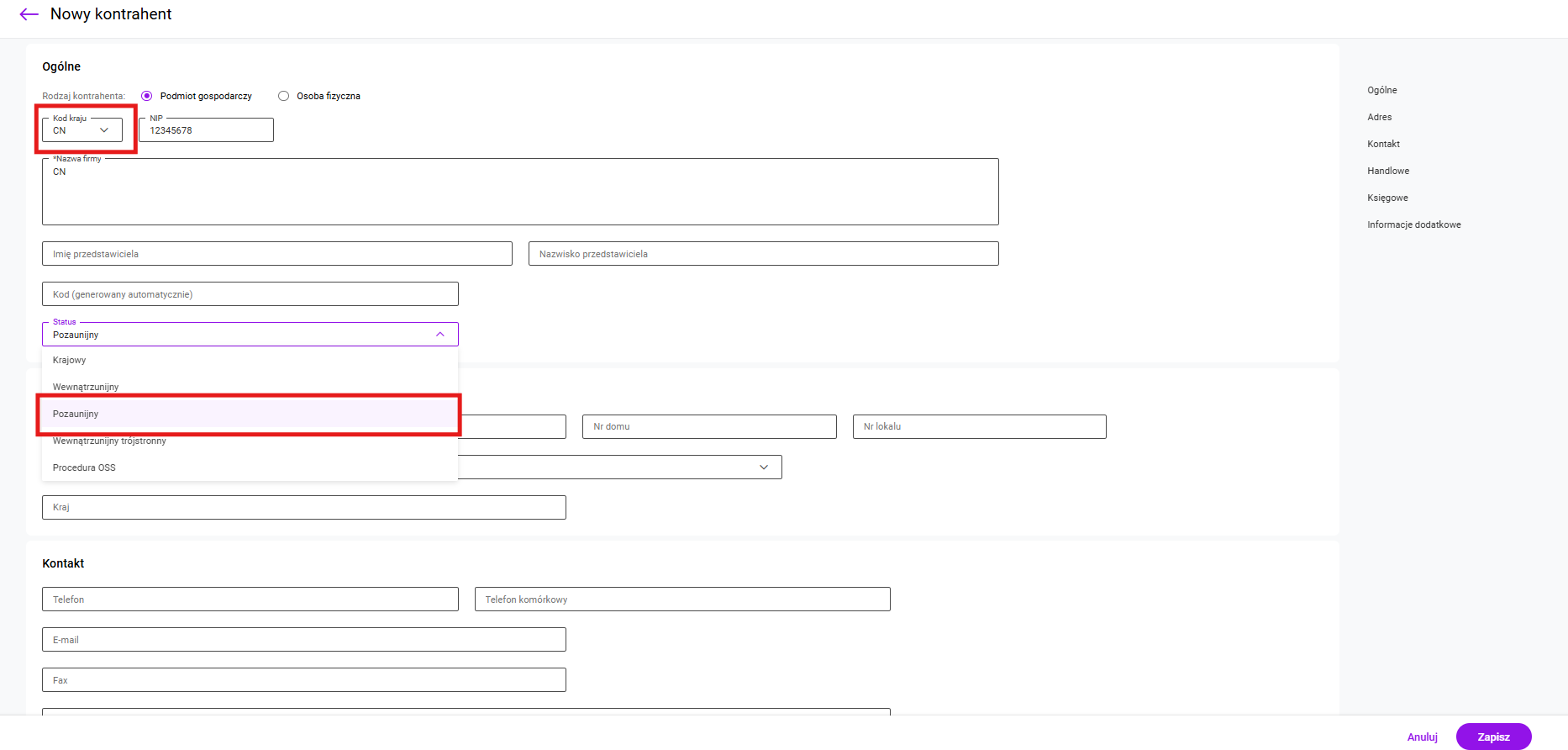Krok pierwszy – dodanie karty kontrahenta o statusie pozaunijny. W tym celu na formularzu kontrahenta w sekcji Ogólne należy ustawić status pozaunijny. Dzięki temu na wystawianych dokumentach automatycznie będą się podstawiać stawki VAT „nie podlega” – dla usług oraz 0% dla towarów. Dla statusu pozaunijny program nie kontroluje poprawności wpisanego numeru NIP a ponadto z listy kodów kraju jest możliwość wyboru właściwego kodu dla kontrahenta.