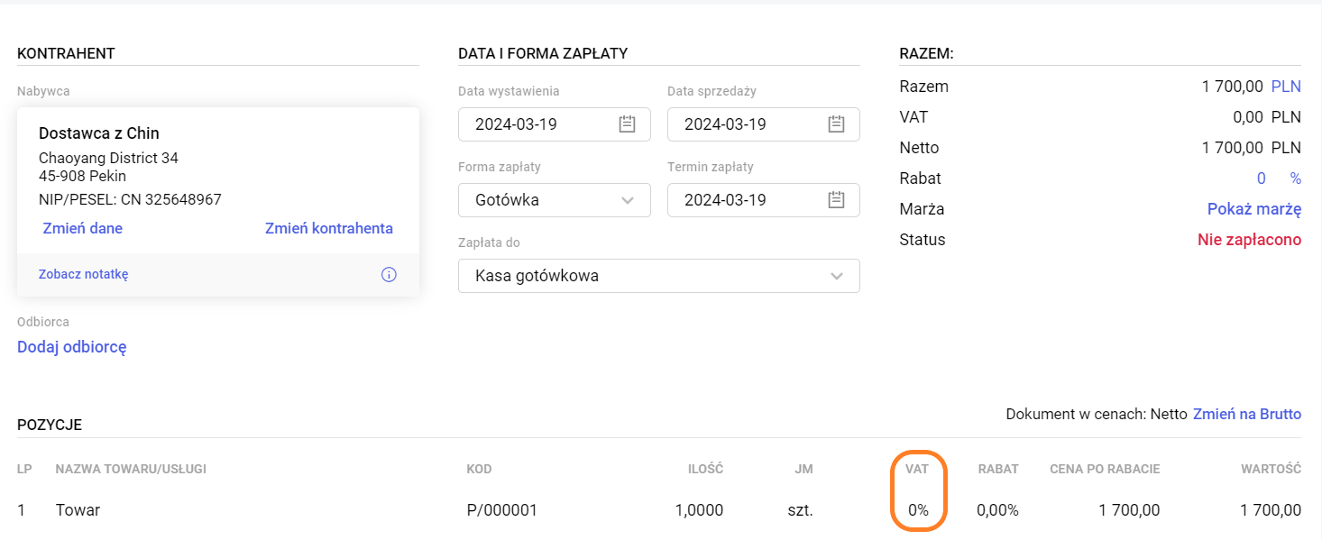 Krok drugi – dodanie w programie faktury sprzedaży dla kontrahenta pozaunijnego (Faktury >> Faktury sprzedaży >> Dodaj fakturę sprzedaży). Po dodaniu produktu program automatycznie w polu VAT ustawi wartość 0% (dla towarów) lub „nie podlega” (dla usług).