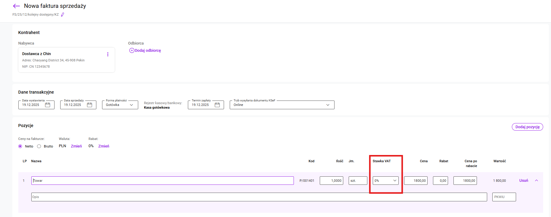 Krok drugi – dodanie w programie faktury sprzedaży dla kontrahenta pozaunijnego ( Przychody / Faktury sprzedaży / Dodaj). Po dodaniu produktu program automatycznie w polu VAT ustawi wartość 0% (dla towarów) lub „nie podlega” (dla usług).