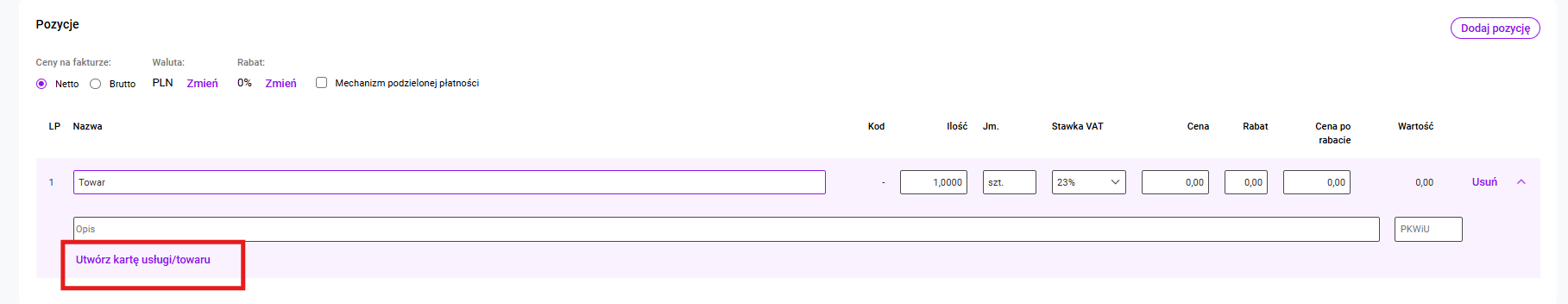 By dodać produkt na fakturę postępujemy analogicznie, jak w przypadku dodawania kontrahenta. Po uzupełnieniu nazwy produkty, możemy go dodać na fakturę klikając w przycisk Dodaj pozycję. Jeśli chcemy dodatkowo zapisać go w naszej bazie produktów, wybieramy przycisk Dodaje kartę produktu.