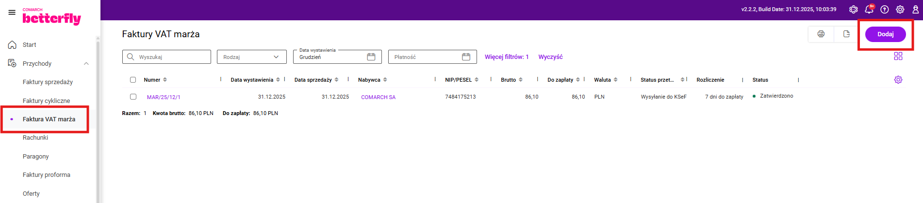 Krok pierwszy – wybieramy Przychody / Faktury VAT marża i klikamy na Dodaj, by dodać nową fakturę.