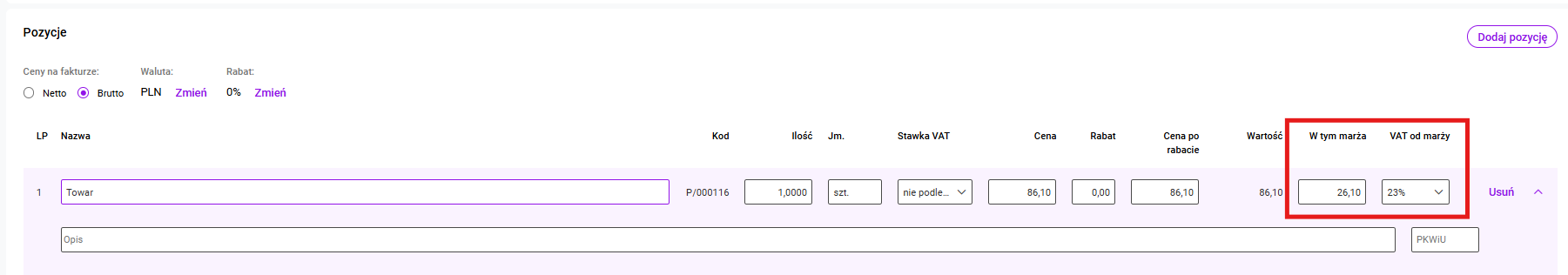 Zmiana wysokości marży oraz stawki VAT od marży będzie możliwa po wcześniejszym dokonaniu zmian w pozycji Cena brutto.