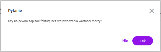 Jeśli pole „W tym marża” nie zostanie uzupełnione, przy próbie zapisania/zatwierdzenia faktury pojawi się pytanie:
