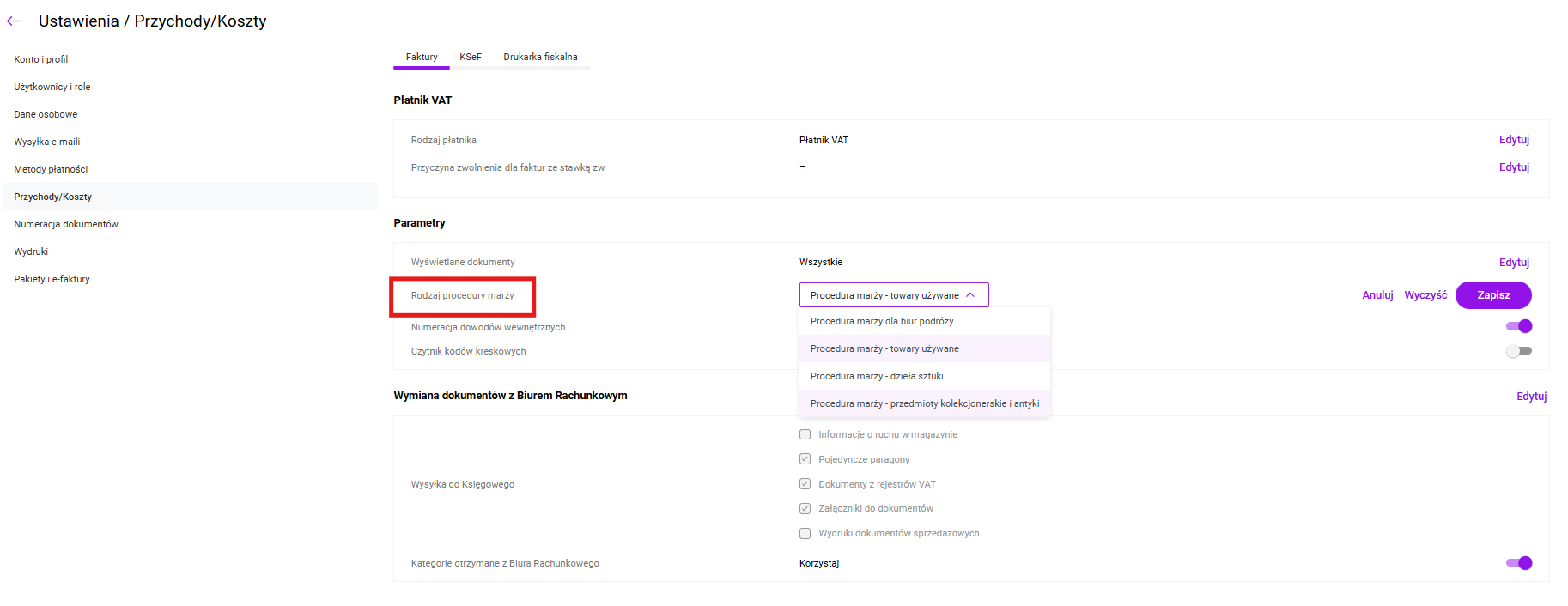 W menu Ustawieniach / Przychody/Koszty na zakładce Faktury, Użytkownik będzie miał możliwość wyboru podstawy stosowania procedury marży z czterech dostępnych kategorii: