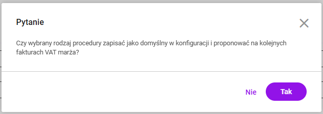 Wybór opcji Tak spowoduje, że wybrany na dokumencie Rodzaj procedury marży zostanie ustawiony jako domyślny w Konfiguracji. Po wyborze opcji Nie faktura VAT marża zostanie zapisana, a Rodzaj procedury marży nie będzie się podstawiał domyślnie na każdej nowo wystawianej fakturze VAT marża.