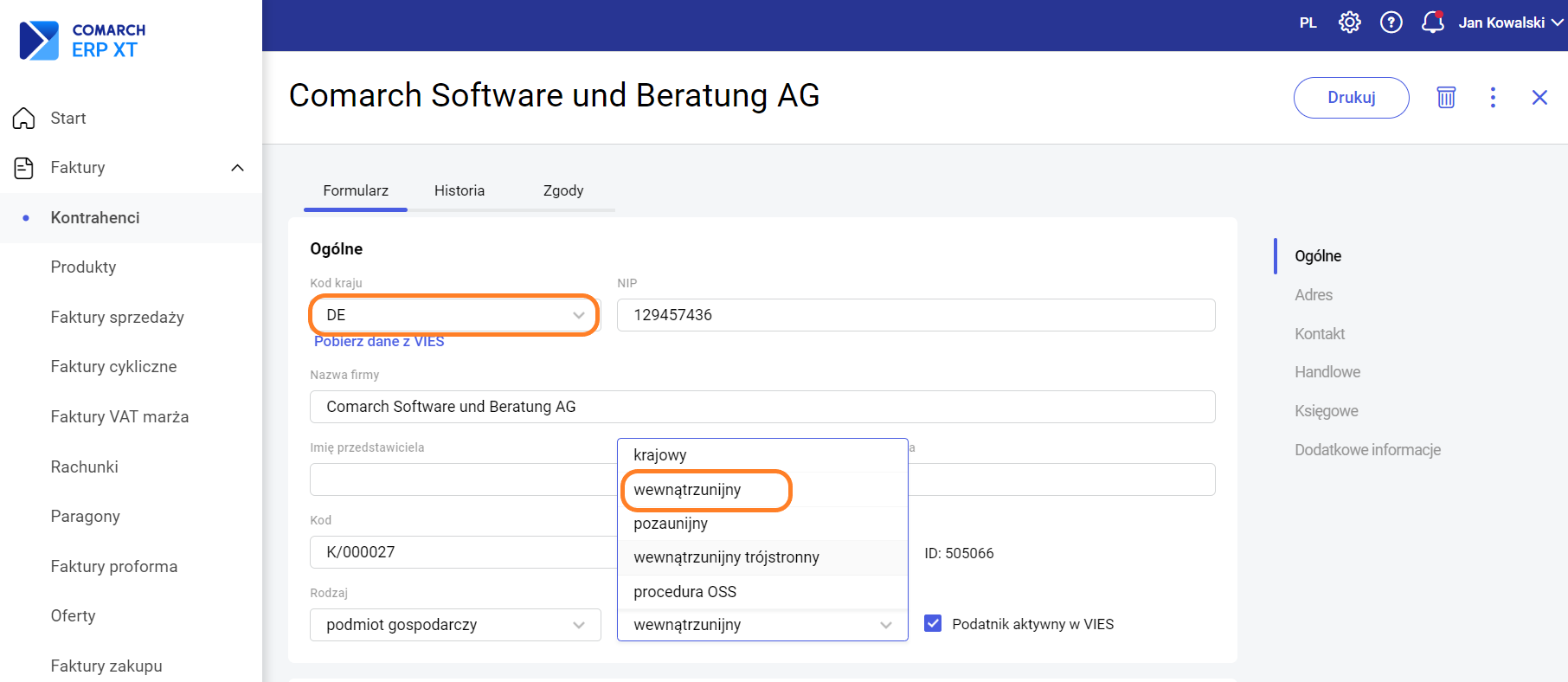 Krok pierwszy – dodanie karty kontrahenta o statusie wewnątrzunijny. W tym celu na formularzu kontrahenta w sekcji Ogólne należy ustawić status wewnątrzunijny oraz uzupełnić przedrostek w numerze NIP. Dzięki temu na wystawianych dokumentach automatycznie będą się podstawiać stawki VAT „nie podlega” – dla usług oraz 0% dla towarów.