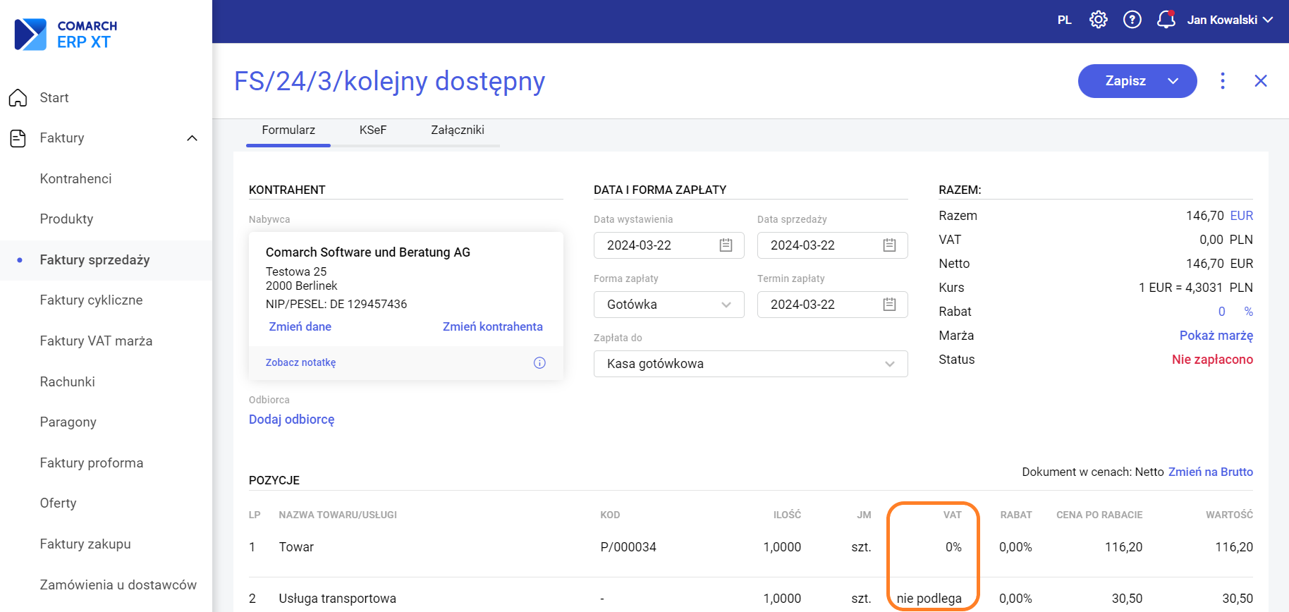 Krok drugi – dodanie w programie faktury sprzedaży dla kontrahenta wewnątrzunijnego (Faktury >> Faktury sprzedaży >> Dodaj fakturę sprzedaży). Jeśli na fakturę zostanie dodany produkt oznaczony na karcie jako towar – program automatycznie w polu VAT ustawi wartość 0%. Jeśli na fakturę zostanie dodany produkt oznaczony jako usługa – automatycznie ustawiona zostanie stawka VAT nie podlega.