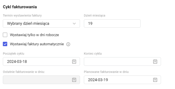 Aby faktury cykliczne były wystawiane automatycznie należy na szablonie w sekcji „Cykl fakturowania” zaznaczyć parametr „Wystawiaj faktury automatycznie”: