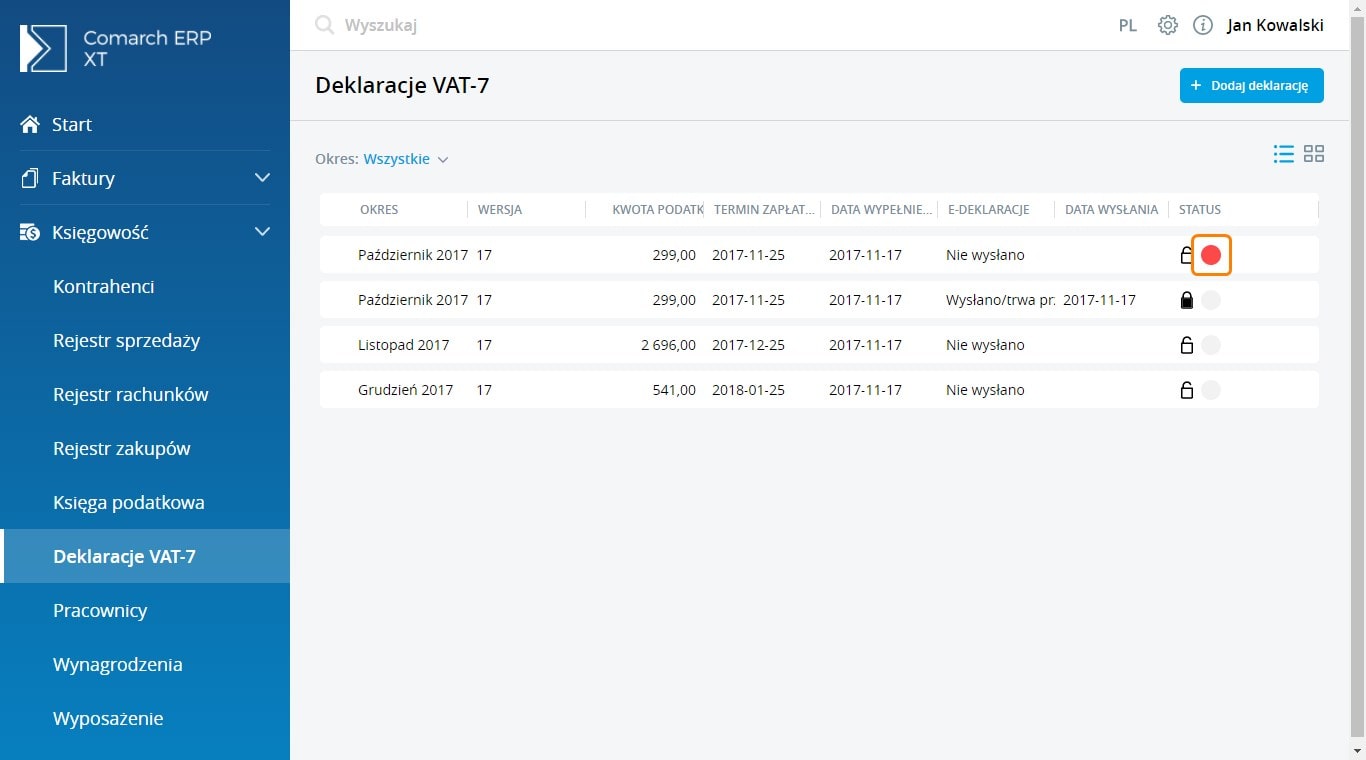 Po zapisaniu na liście deklaracji oprócz pierwotnej deklaracji pojawi się dodatkowo korekta deklaracji (na liście oznaczona czerwoną kropką).