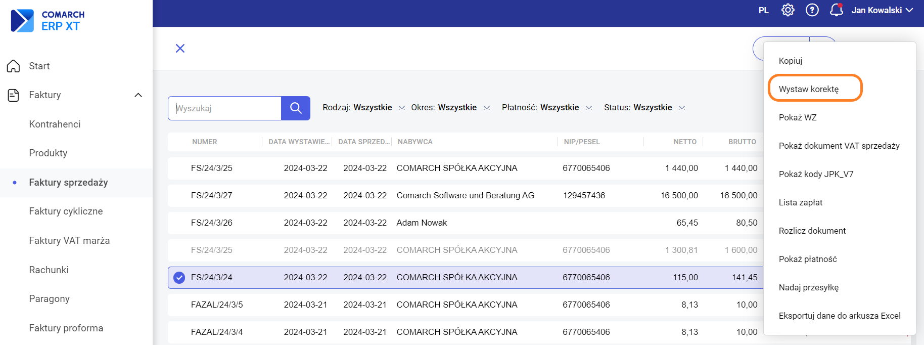 Krok pierwszy – zaznaczamy odpowiedni dokument i z menu kontekstowego wybieramy opcję „Wystaw korektę”.