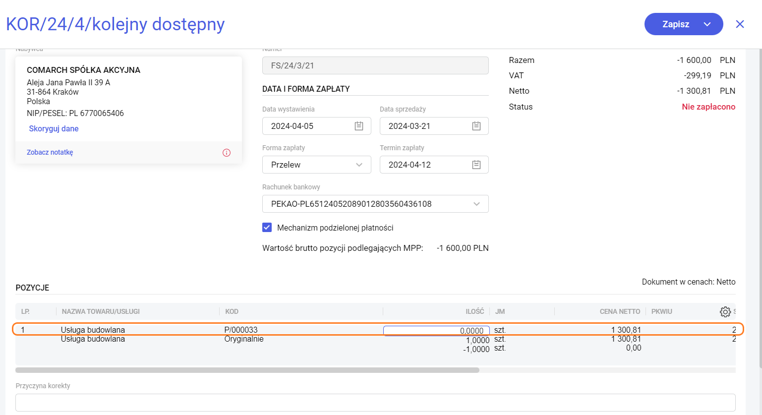 Krok drugi – na formularzu korekty pozycja jest widoczna w dwóch wierszach: w dolnym są widoczne wartości oryginalne (z faktury), natomiast w pierwszym wprowadzamy poprawne wartości i zapisujemy bądź zatwierdzamy dokument.