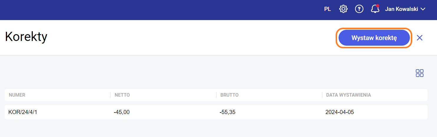 Jeśli dokument posiada już korektę, to na liście przy dokumencie widoczny będzie symbol , zaś w menu kontekstowym w miejscu „Wystaw korektę” pojawi się przycisk „Korekty”. Wówczas, po jego wybraniu, znajdziemy się na liście korekt. Aby dodać kolejną korektę należy wybrać przycisk „plusa” będący dostępny w menu.