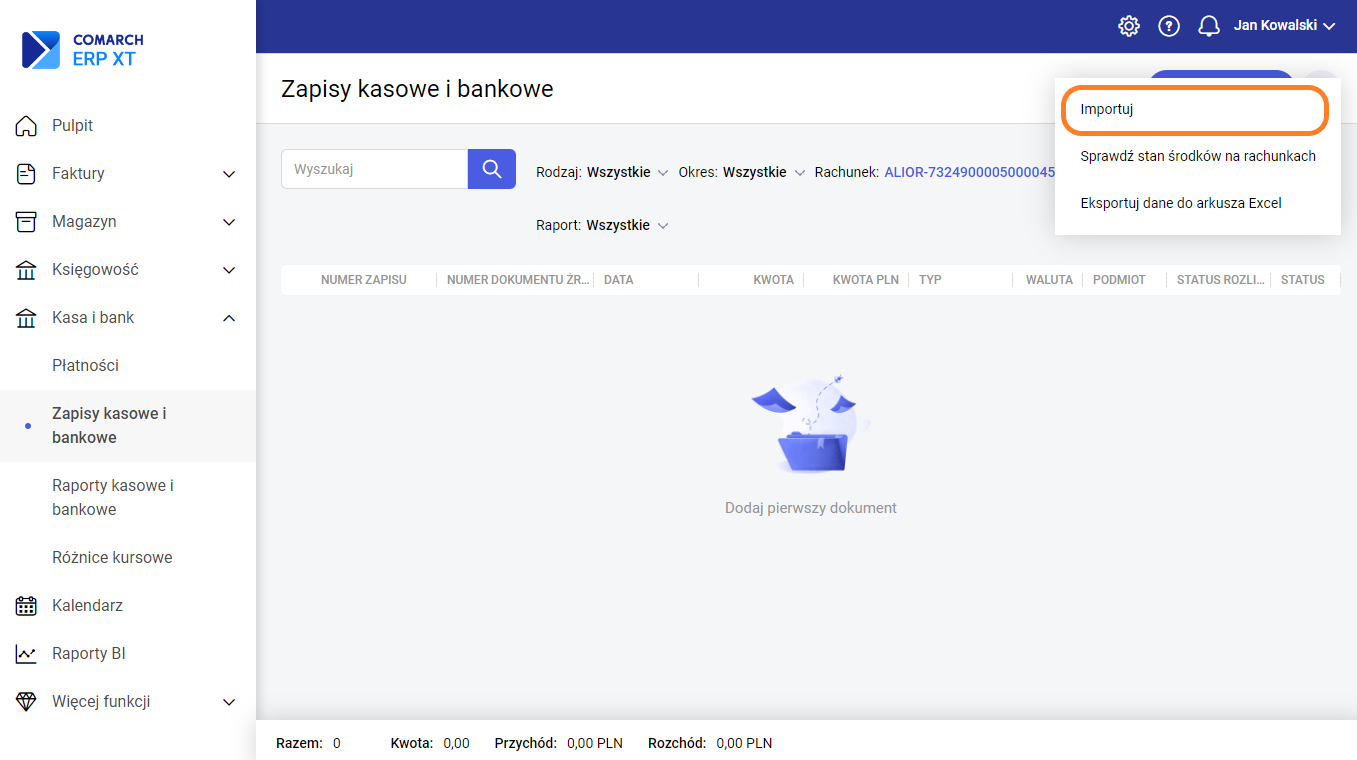 Opcja importu jest dostępna w menu kontekstowym na liście Zapisów kasowych/bankowych, która ma ustawiony filtr na konkretny rachunek bankowy.