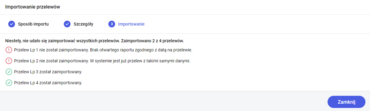 Kliknięcie przycisku Importuj powoduje zapisanie przelewów na liście zapisów kasowych/bankowych. Aby przelewy zaimportowały się poprawnie, w programie musi być otwarty raport bankowy na dzień przelewu. Dodatkowo program sprawdza czy taki przelew nie został już wcześniej zaimportowany. W przypadku zablokowania importu wyświetlany jest stosowny komunikat informujący o przyczynie.