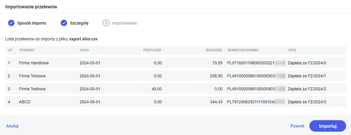 Po kliknięciu Dalej przelewy zostaną zaczytane z pliku i wyświetlone. Użytkownik może teraz sprawdzić czy wszystkie dane są poprawne. Program pokazuje nazwę podmiotu, datę, wartość wpłaty oraz wypłaty oraz numer rachunku bankowego odczytany z pliku.