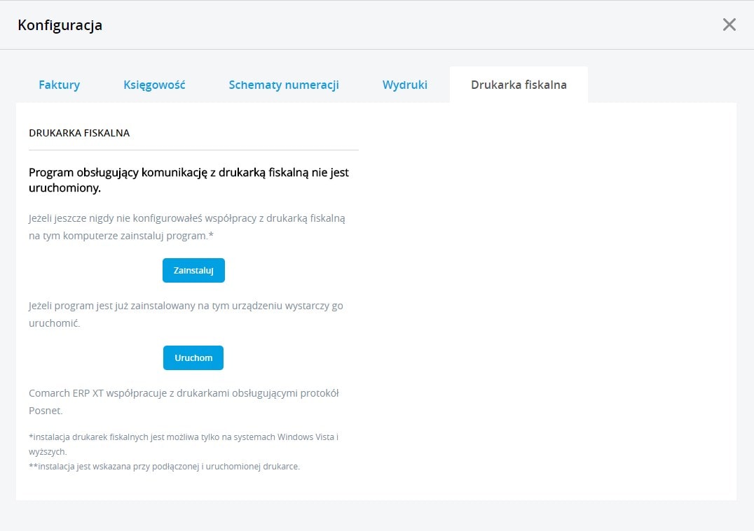Przed rozpoczęciem pracy z urządzeniem fiskalnym należy zainstalować program, który będzie pośredniczył w wysyłaniu danych z programu do drukarki. Aby zainstalować program należy wybrać Konfiguracja/ Drukarka fiskalna. Zalecane jest, aby w momencie instalacji urządzenie fiskalne było podpięte i włączone, natomiast po zainstalowaniu należy ponownie uruchomić komputer.
