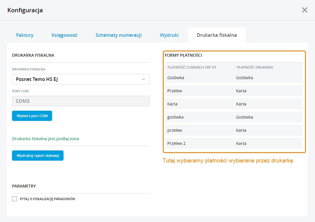 Po zaakceptowaniu certyfikatu użytkownik ma możliwość skonfigurowania parametrów pracy drukarki. Ustawiamy tutaj drukarkę fiskalną, port COM, a także formy płatności drukarki.
