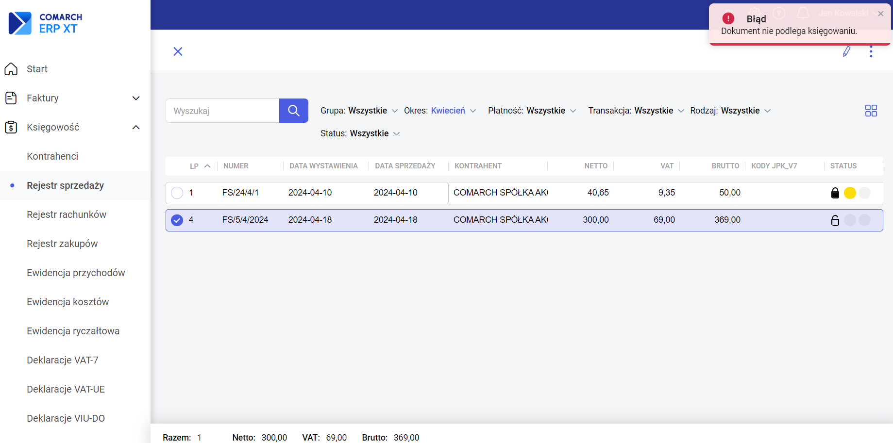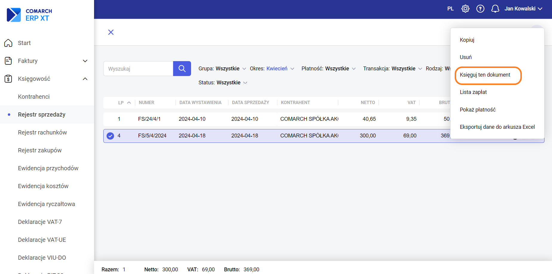Opcja „Księguj ten dokument” jest również widoczna w menu po zaznaczeniu odpowiedniego dokumentu.
