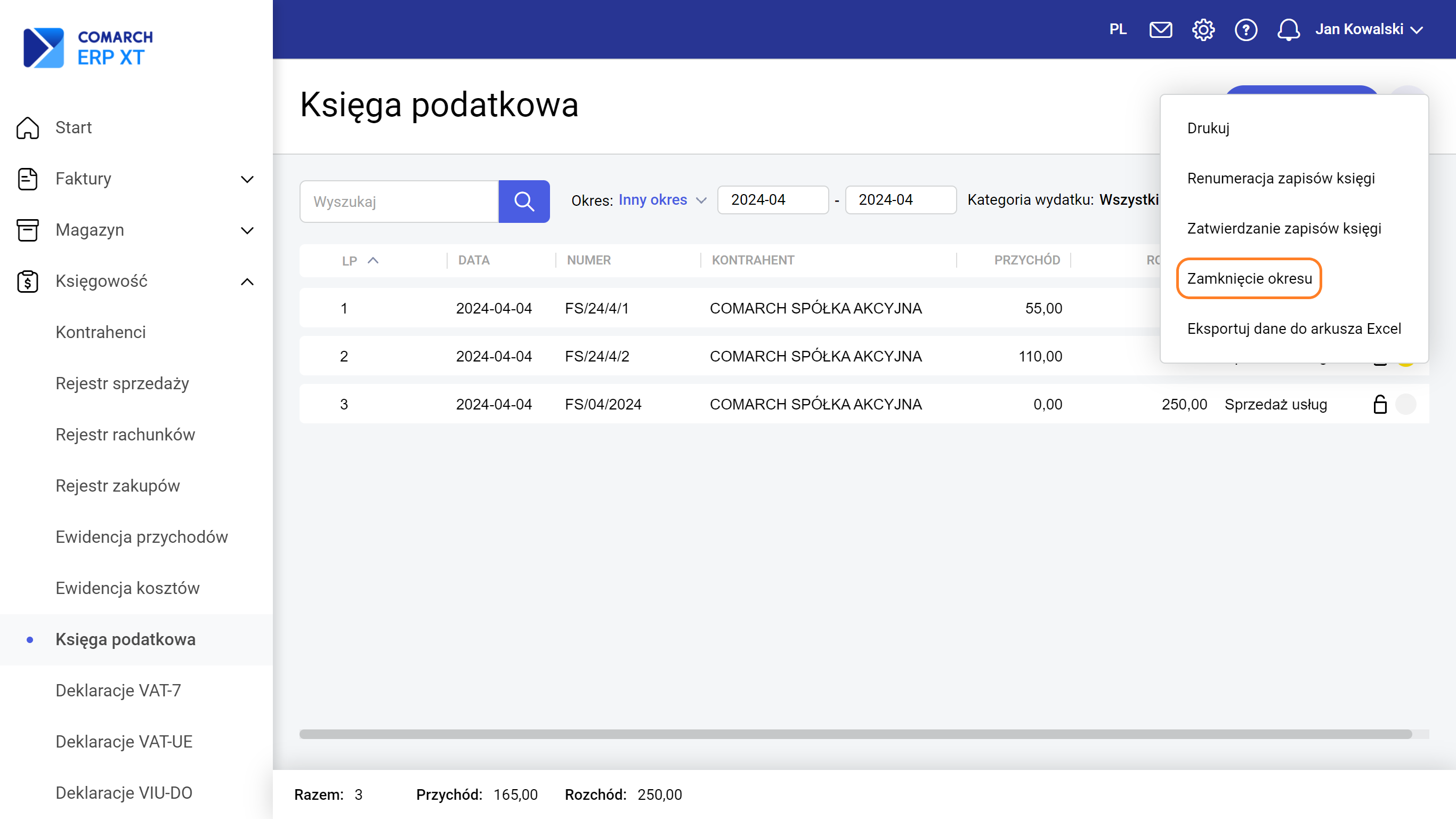 Krok pierwszy – na liście zapisów w Księdze podatkowej z menu kontekstowego wybrać opcję „Zamknięcie okresu”.