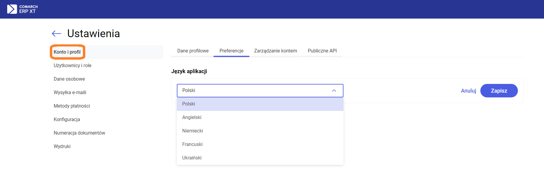 Po wybraniu opcji Konfiguracja otwarte zostanie okno z ustawieniami konfiguracyjnymi związanymi z poszczególnymi obszarami w programie, gdzie należy przejść do Konto i profil, a następnie na zakładkę Preferencje. Dostępne języki interfejsu w Comarch Betterfly to: