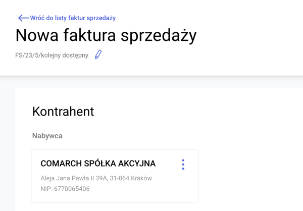 Zmiana numeru dokumentu na fakturach sprzedaży (oraz korektach) jest możliwa podczas wystawiania nowego dokumentu oraz na dokumentach zapisanych ”do bufora”. Aby zmienić numer należy na formularzu kliknąć: