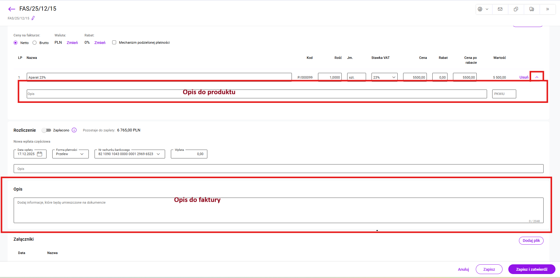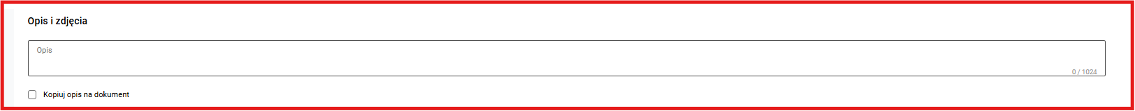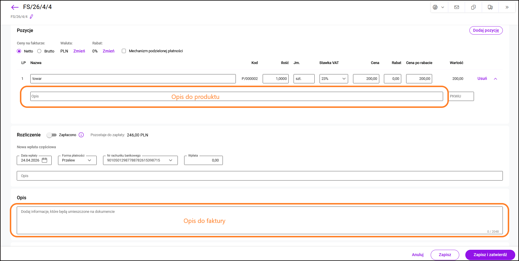 W polu OPIS, w dolnej części faktury możemy dodać dodatkowe informacje do dokumentu. Będzie on później wyświetlany na liście faktur w kolumnie Opis oraz pojawi się na wydruku faktury.
