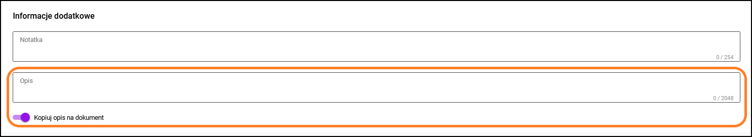 Pole OPIS może być też automatycznie uzupełnione, jeśli na fakturze zostanie wybrany kontrahent, który na swojej karcie ma wpisane Informacje dodatkowe i zaznaczony parametr: Kopiuj dodatkowe informacje na dokument.