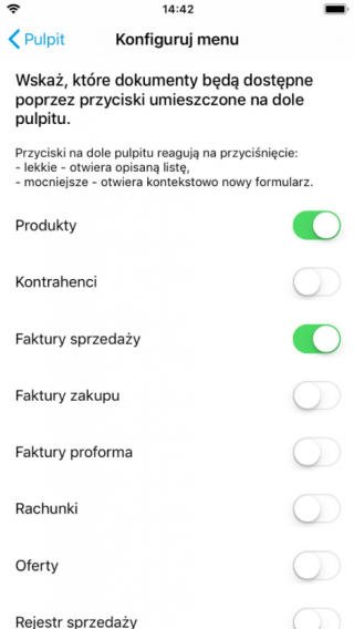 Wybrane przyciski będą widoczne w dolnej części pulpitu. W urządzeniach obsługujących 3DT lekkie naciśnięcie przycisku przeniesie nas na wybraną listę dokumentów. Natomiast mocniejsze naciśnięcie – otworzy od razu formularz nowego dokumentu. Na pozostałych urządzeniach funkcje te są wywoływane odpowiednio przez krótsze/ dłuższe przytrzymanie przycisku. Oprócz przycisków szybkiego dostępu do wybranych dokumentów na pulpicie zawsze dostępny jest przycisk plusa, który pozwoli na dodanie nowego dokumentu dowolnego typu.