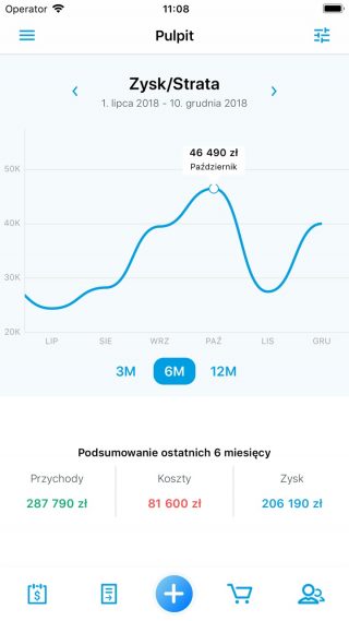 Po zalogowaniu do aplikacji zostajemy przeniesieni na ekran startowy. Główną częścią pulpitu jest wykres przedstawiający dane finansowe naszej firmy. Przesuwając ekran w lewo lub prawo możemy przełączać się pomiędzy wykresami opisującymi Zyski/Straty, Przychody oraz Koszty. Natomiast przyciski poniżej wykresu służą do ustawienia zakresu dat na ostatnie 3, 6 lub 12 miesięcy.