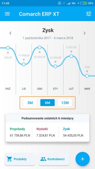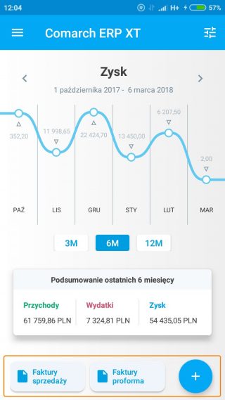 Po zalogowaniu do aplikacji zostajemy przeniesieni na ekran startowy. Główną częścią pulpitu jest wykres przedstawiający dane finansowe naszej firmy. Przesuwając ekran w lewo lub prawo możemy przełączać się pomiędzy wykresami opisującymi Zyski/Straty, Przychody oraz Koszty. Natomiast przyciski poniżej wykresu służą do ustawienia zakresu dat na ostatnie 3, 6 lub 12 miesięcy.