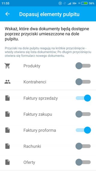 Wybrane przyciski będą widoczne w dolnej części pulpitu. Naciśnięcie przycisku przeniesie nas na wybraną listę dokumentów. Natomiast długie przytrzymanie otworzy od razu formularz nowego dokumentu. Oprócz przycisków szybkiego dostępu do wybranych dokumentów na pulpicie zawsze dostępny jest przycisk plusa, który pozwoli na dodanie nowego dokumentu dowolnego typu.
