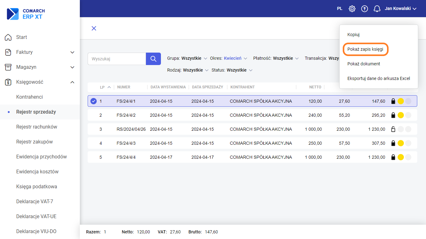 Jeśli faktura jest zaksięgowana istnieje możliwość podejrzenia powiązanego zapisu w księdze podatkowej. W tym celu będąc w rejestrze VAT zaznaczamy konkretny zapis i z menu pod trzema kropkami (w prawym górnym rogu) wybieramy opcję Pokaż zapis księgi.