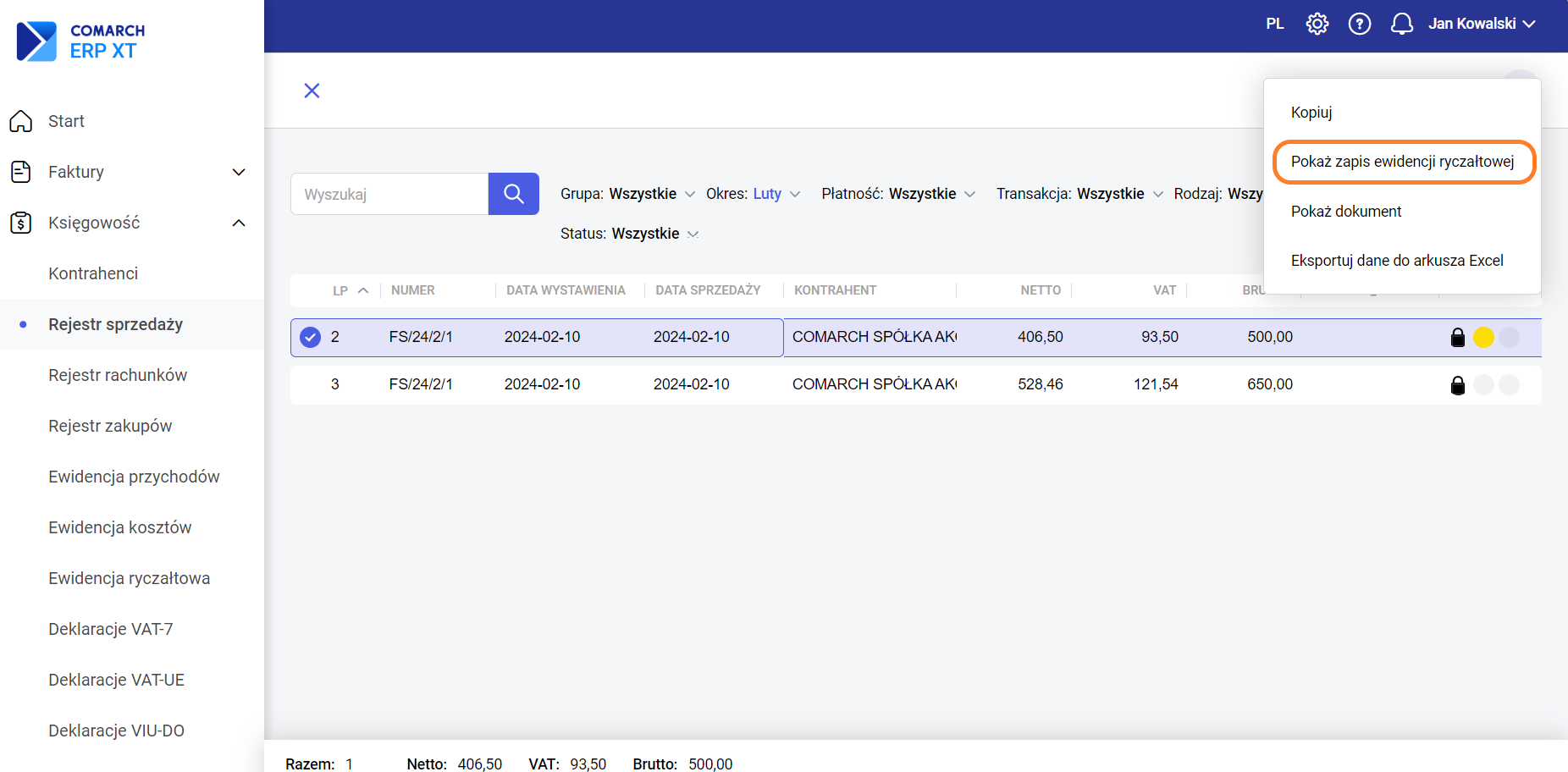 Jeśli dokument jest zaksięgowany istnieje możliwość podejrzenia powiązanego zapisu w ewidencji ryczałtowej. W tym celu na liście w rejestrze VAT sprzedaży należy zaznaczyć konkretny zapis i z menu pod trzema kropkami wybrać opcję „Pokaż zapis ewidencji ryczałtowej”.