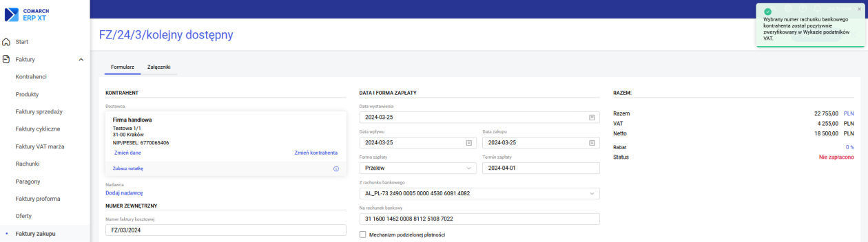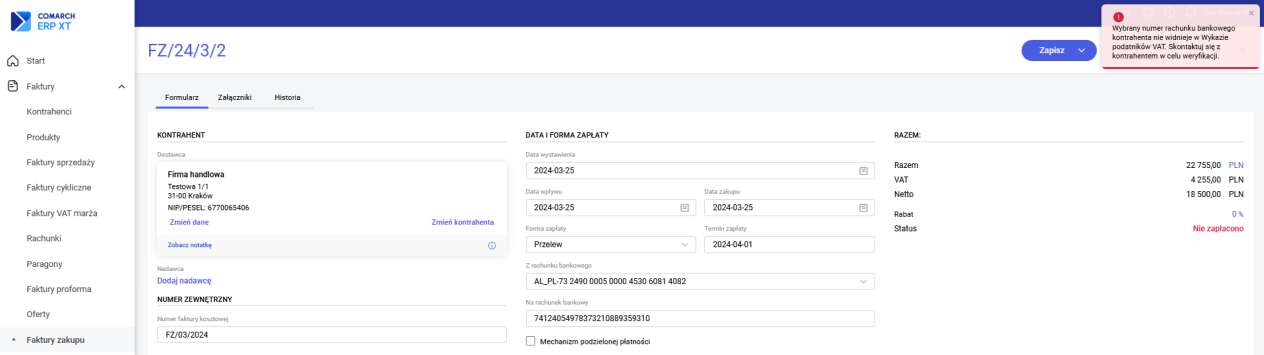 Jeżeli numeru rachunku bankowego nie ma w Wykazie podatników VAT lub numer rachunku nie jest uzupełniony na karcie kontrahenta, Użytkownik otrzymuje odpowiedni komunikat natomiast nie jest blokowana możliwość zapisania dokumentu czy wysłania przelewu.