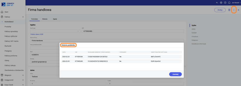 Historię weryfikacji rachunku podatnika VAT można sprawdzić z poziomu formularza karty kontrahenta. W prawym górnym rogu w menu należy wybrać opcję: Historia podatnika.