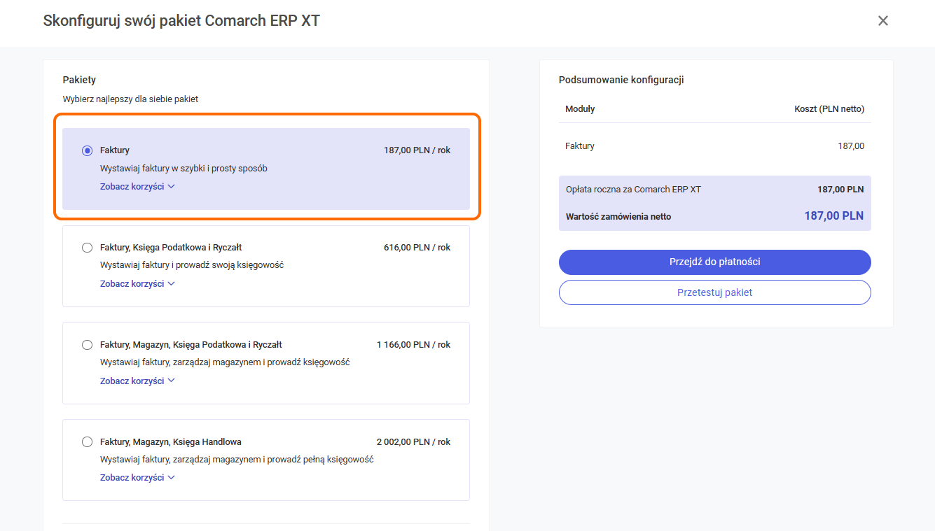 - Klient zobowiązany jest posiadać konto na Comarch Betterfly z wybranym pakietem Faktury,
