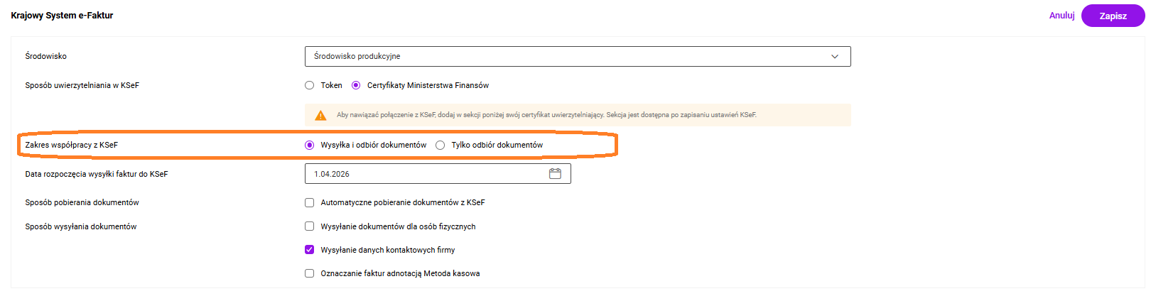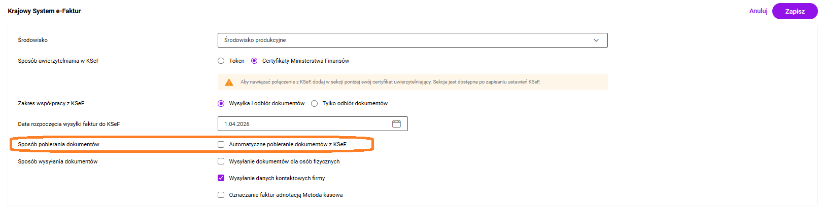 • Tylko odbiór dokumentów: Opcja przeznaczona dla użytkowników, którzy od 1 lutego 2026 r. nie mają jeszcze obowiązku wysyłania własnych faktur do KSeF, ale są zobowiązani do pobierania faktur zakupowych wystawionych przez ich dostawców.