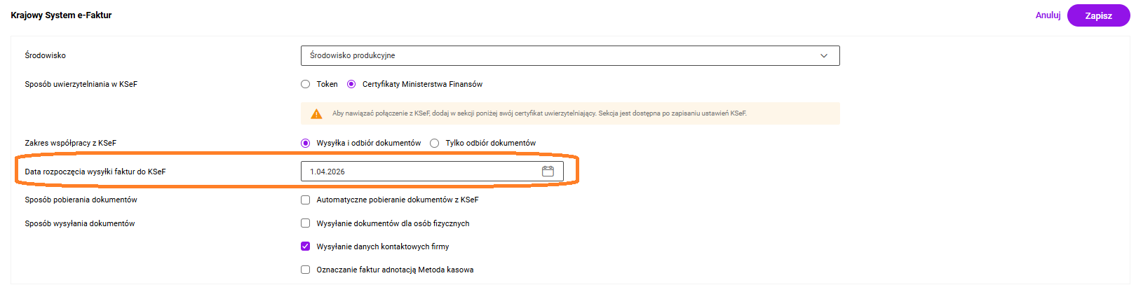 Wskazanie tej daty pozwala określić moment, od którego dokumenty zatwierdzane w programie będą automatycznie przekazywane do systemu krajowego. Podczas pierwszej konfiguracji lub zmiany środowiska (np. z Demo na Produkcyjne), program automatycznie podpowie w tym miejscu datę bieżącą, która uzytkownik może zmodyfikować zgodnie z rzeczywista data rozpoczęcia wysyłki.