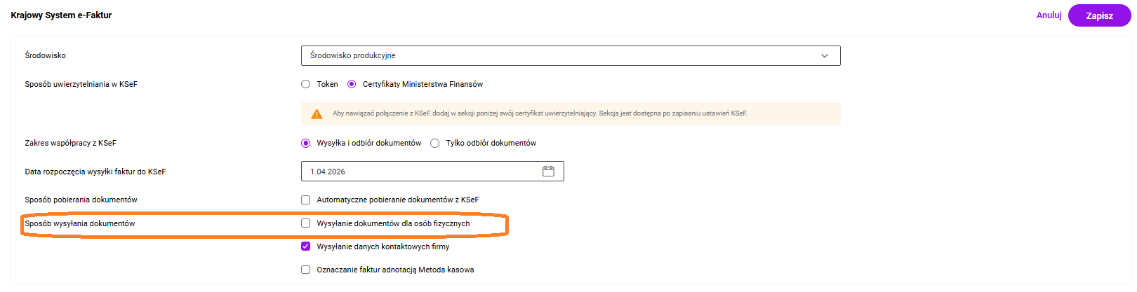 Parametr zaznaczony: Faktury dla osób fizycznych będą traktowane jak standardowe e-faktury i przesyłane do systemu KSeF.