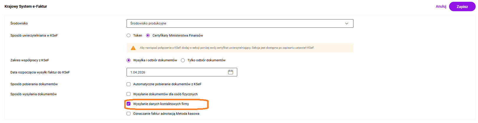Użytkownik ma możliwość określenia, czy dane kontaktowe jego firmy, takie jak adres e-mail oraz numer telefonu, powinny być przekazywane w strukturze e-Faktury do Krajowego Systemu e-Faktur.