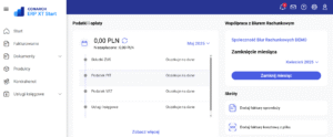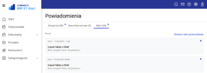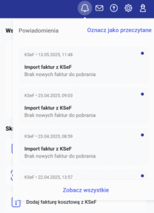 Każdy komunikat ma oznaczenie niebieskiej kropki, jeśli jest nieprzeczytany. Komunikaty można oznaczać zbiorczo poprzez opcję „Oznacz jako przeczytane” lub pojedynczo. Jeśli komunikat dotyczy konkretnego dokumentu, po kliknięciu nastąpi automatyczne przejście np. do płatności z Biura Rachunkowego lub faktury sprzedaży wysłanej do KSeF.