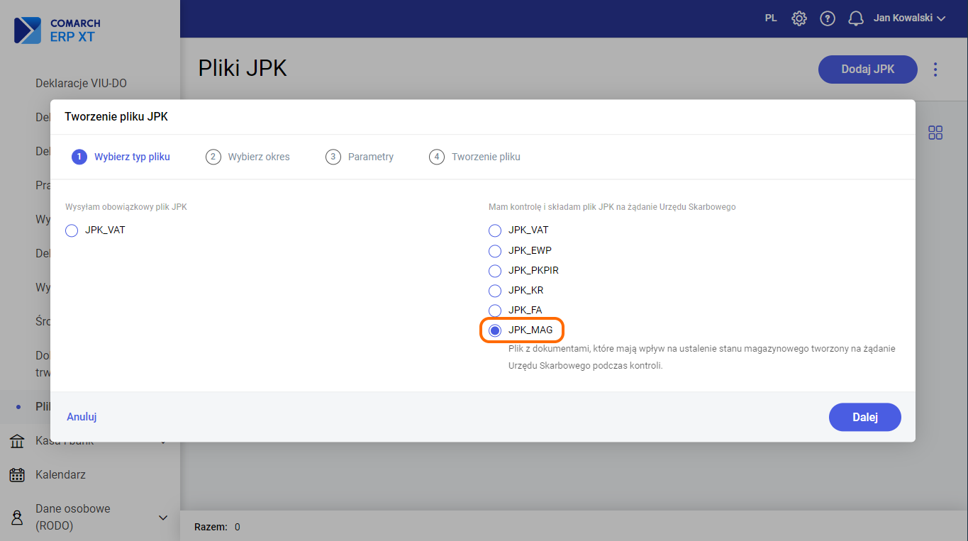 Aby utworzyć plik JPK, należy przejść do zakładki Księgowość/ Pliki JPK/ Pozostałe pliki JPK. Następnie należy kliknąć Dodaj JPK, pojawi się kreator na którym wybieramy JPK_MAG.