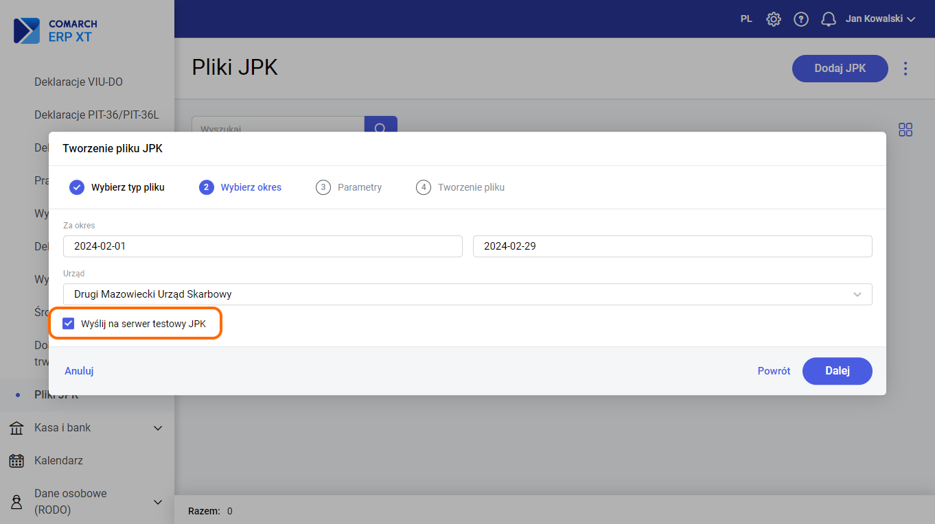 Na kolejnych oknach wybieramy okres, Urząd Skarbowy oraz ustalamy czy plik ma zostać wysłany na serwer testowy czy produkcyjny.