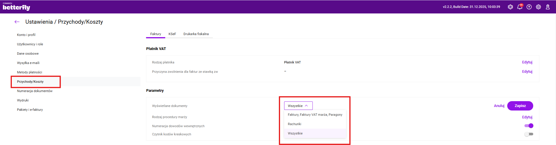 Bez względu na wybraną wartość pozostaje możliwość wprowadzania faktur zakupu i zamówień dostawców.