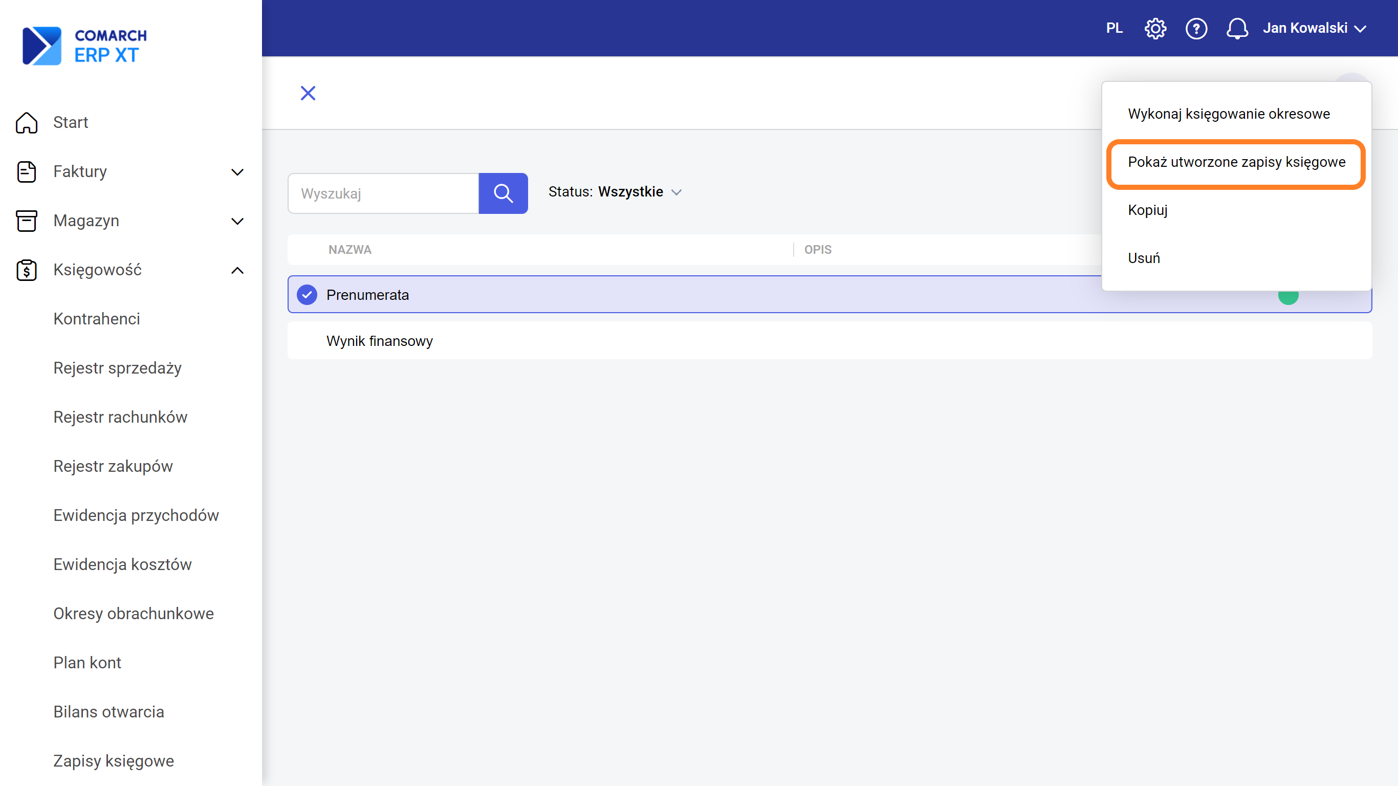 Po wykonaniu księgowania okresowego istnieje możliwość podglądu powiązanego dekretu księgowego. W menu kontekstowym jest dostępna opcja ‘Pokaż utworzone zapisy księgowe’: