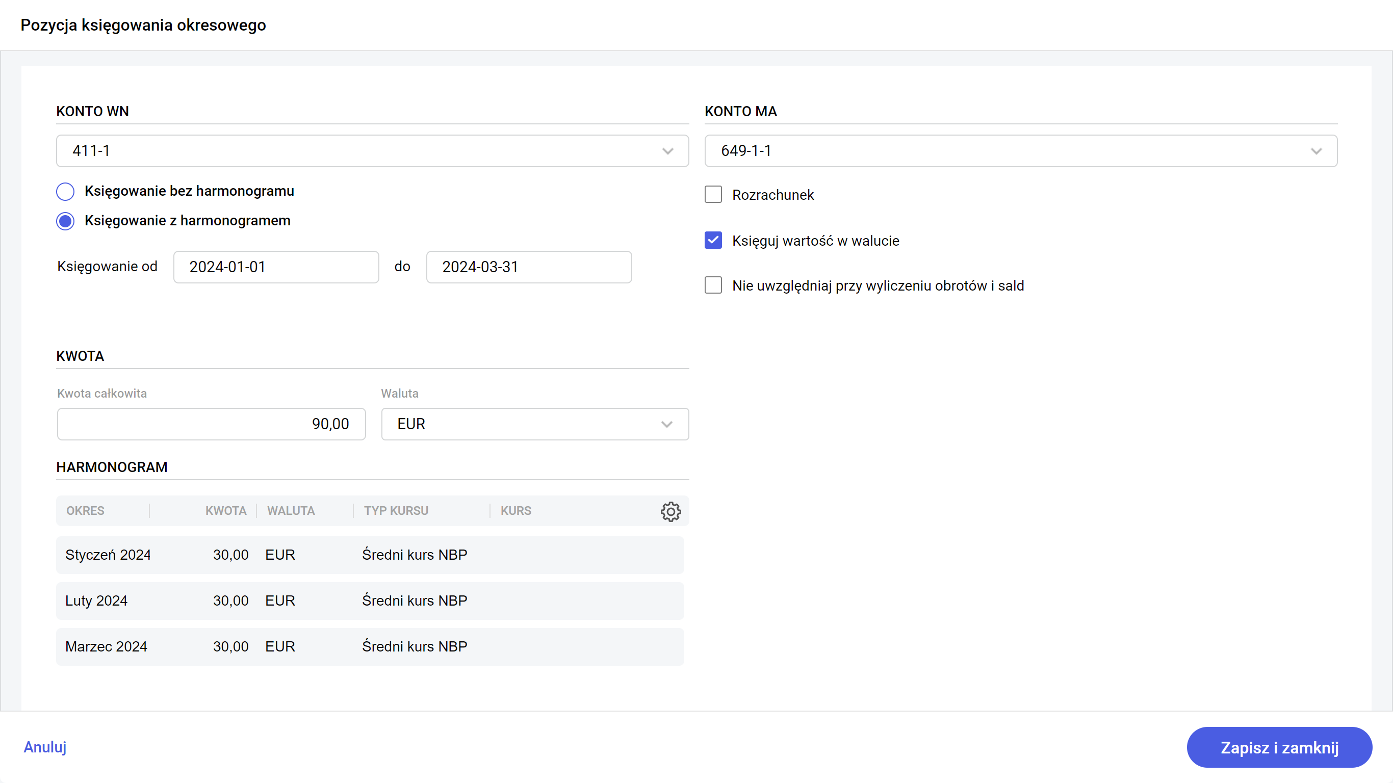 - kurs średni NBP – na powiązanych zapisach księgowych zostanie ustawiony kurs z dnia poprzedniego w stosunku do daty wykonania księgowanie okresowego,