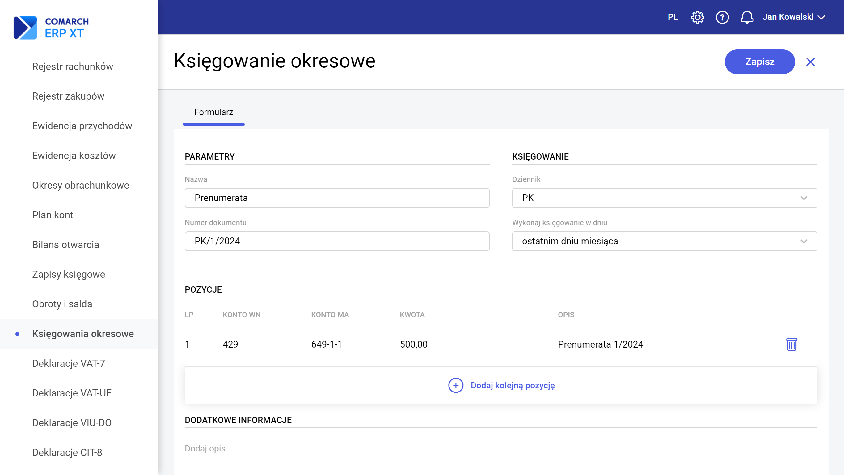 Dodatkowe informacje – dodatkowe informacje o księgowaniu okresowym. Uzupełnienie pola nie jest wymagane.